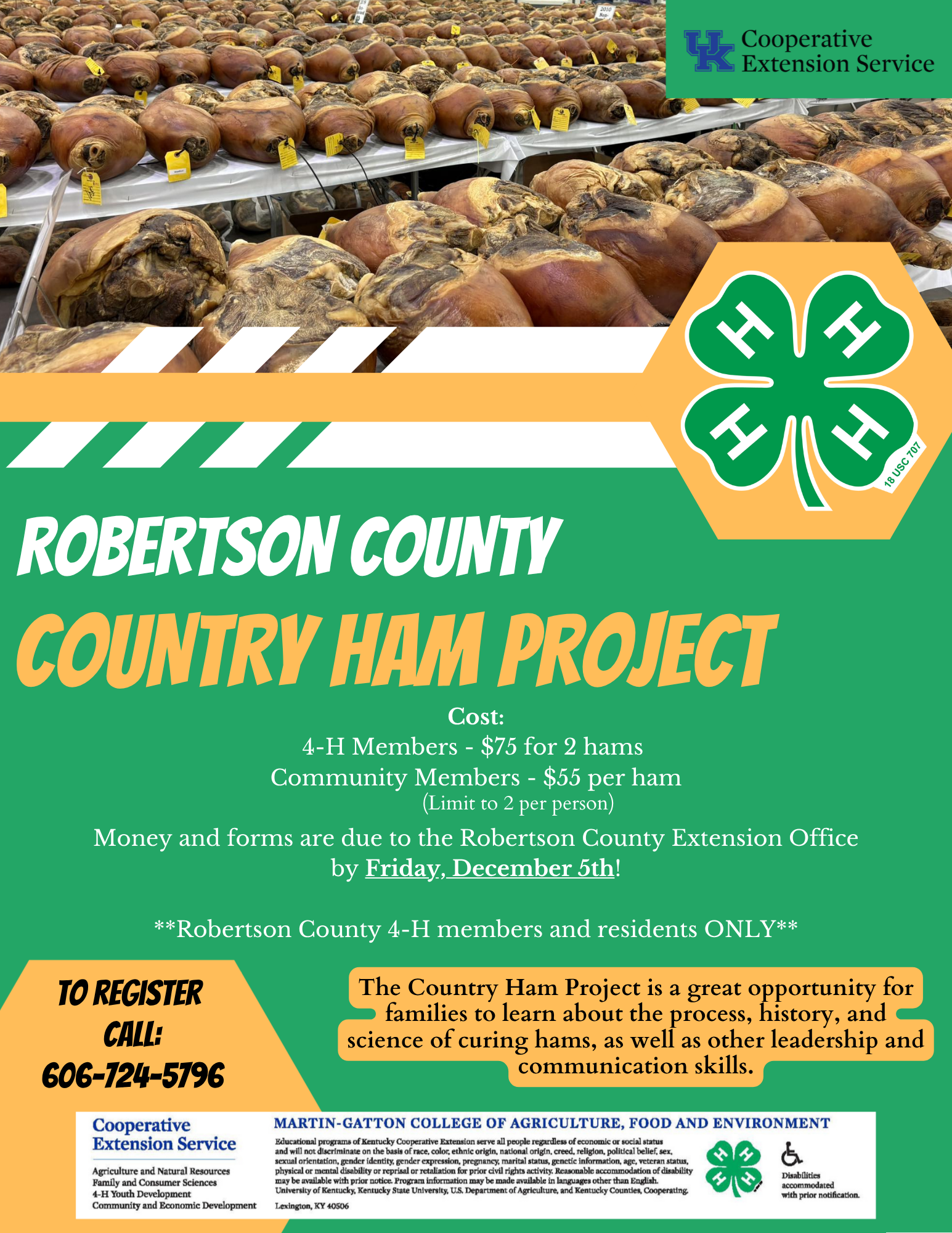In-PersonIt is that time of the year to sign up for the country ham project! Youth must be aged 9-18 (as of January 1, 2026) in order to participate in the 4-H Country Ham Project. The cost for 4-H youth is $75. They will receive 2 hams. Youth must give a speech at the KY State Fair. Youth have the option of auctioning one of their hams off at the Robertson County Livestock Show and Sale in September. The Deadline is December 5th, 2025.